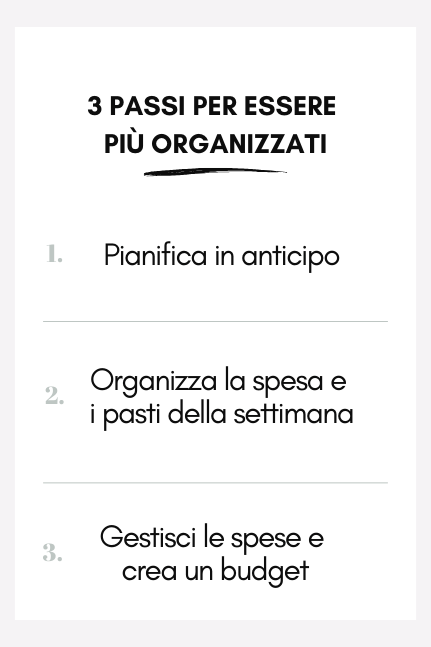 Imparare a pianificare impegni e attività, risparmiare tempo su compiti quotidiani come la preparazione di pranzo e cena e imparare a gestire il proprio budget sono i miei 3 consigli su come essere più organizzati e su come aumentare la produttività. Che tu stia leggendo questo articolo a fine anno, inizio anno o in qualsiasi altro momento non ha importanza: è sempre il momento giusto per iniziare ad avere delle buone abitudini di organizzazione e le 3 di cui ti ho parlato oggi puoi iniziare a metterle in pratica quando vuoi!