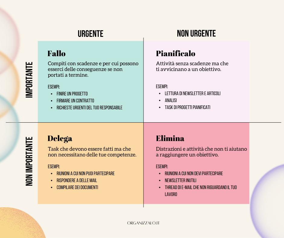 Dividendo in questi quattro quadranti le attività da svolgere, riuscirai a capire cosa ha bisogno di una lavorazione immediata e cosa invece può aspettare, o essere delegato ad altre persone.