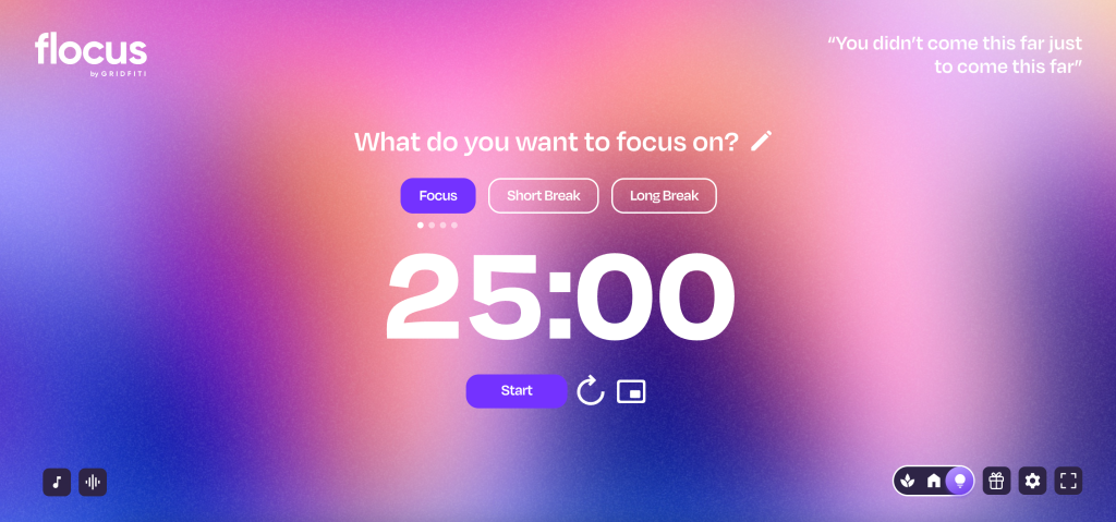 Puoi usare un timer da cucina, il telefono o un’app dedicata. Io per esempio mi trovo molto bene con Flocus, che uso direttamente dal computer: ti permette di impostare il timer che preferisci e la lunghezza delle pause, inoltre puoi personalizzare la schermata con degli sfondi molto aesthetic e rilassanti. Per usare Flocus basta solo registrarsi con la mail. Esiste anche una versione Plus per sbloccare alcune funzionalità e sfondi ma l’opzione gratuita è più che valida.