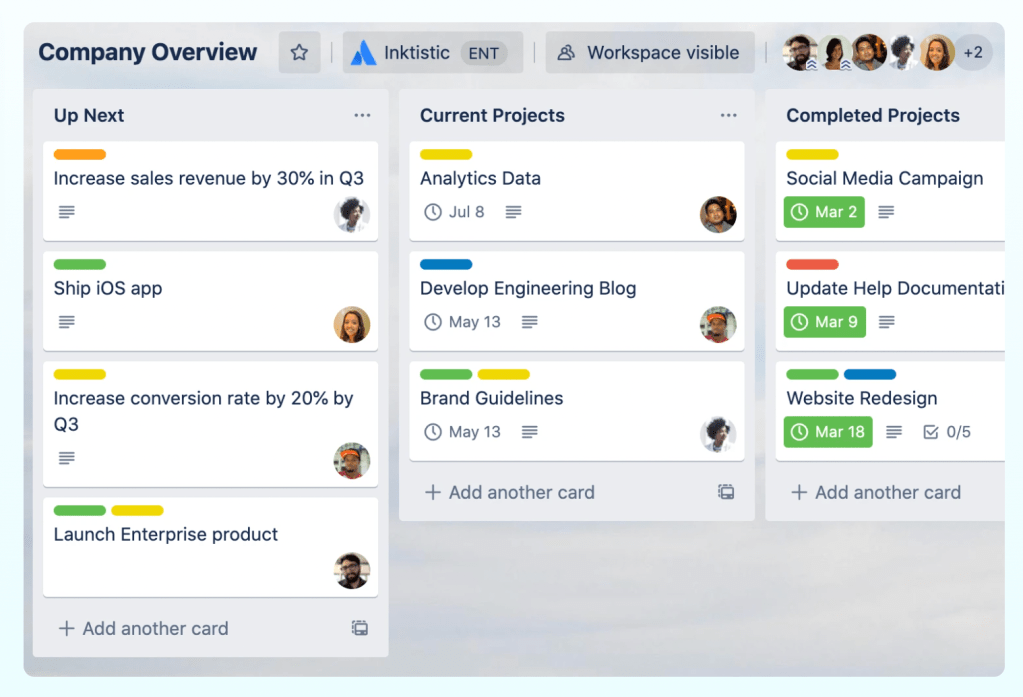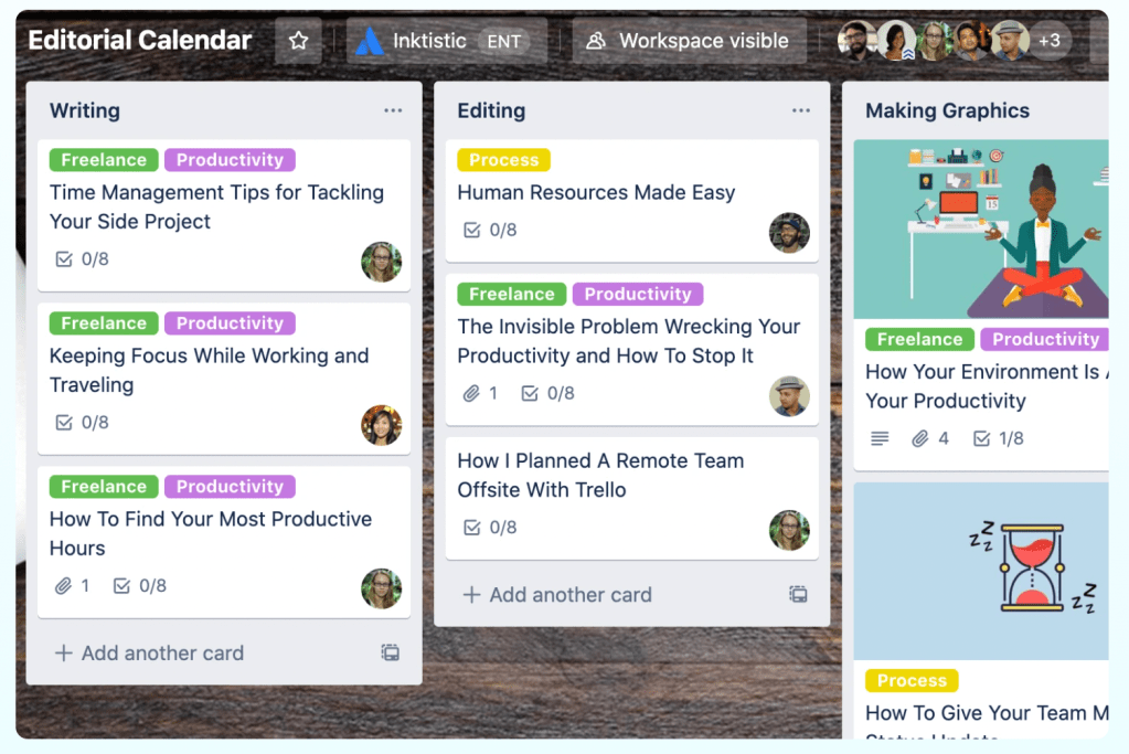Purtroppo non posso farti uno screenshot del mio Trello (eheh), ma ti lascio qui degli esempi di utilizzo presi direttamente dal sito ufficiale di Trello: